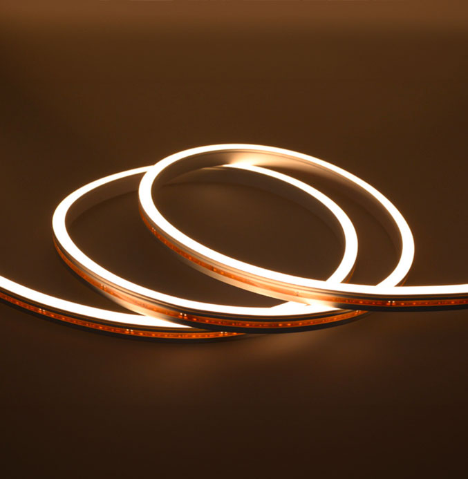 Neon Single Color Side Bend LED strip light is a versatile, 24-Volt, IP66-rated lighting solution for both indoor and outdoor accent applications, such as closet cabinetry, floating shelves, and architectural features. Available in various section lengths, each strip includes 3-foot wire leads and can be cut to size at 2-inch intervals, although it
