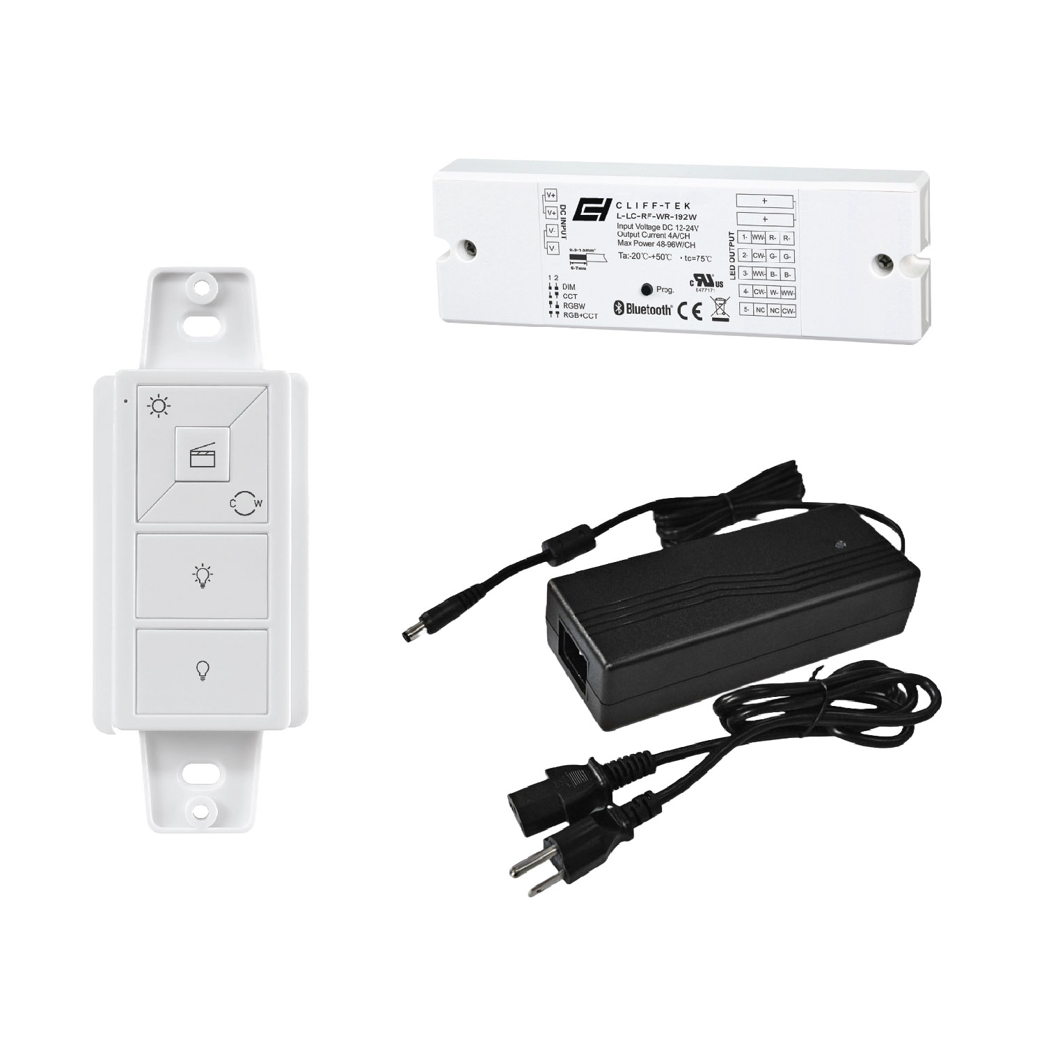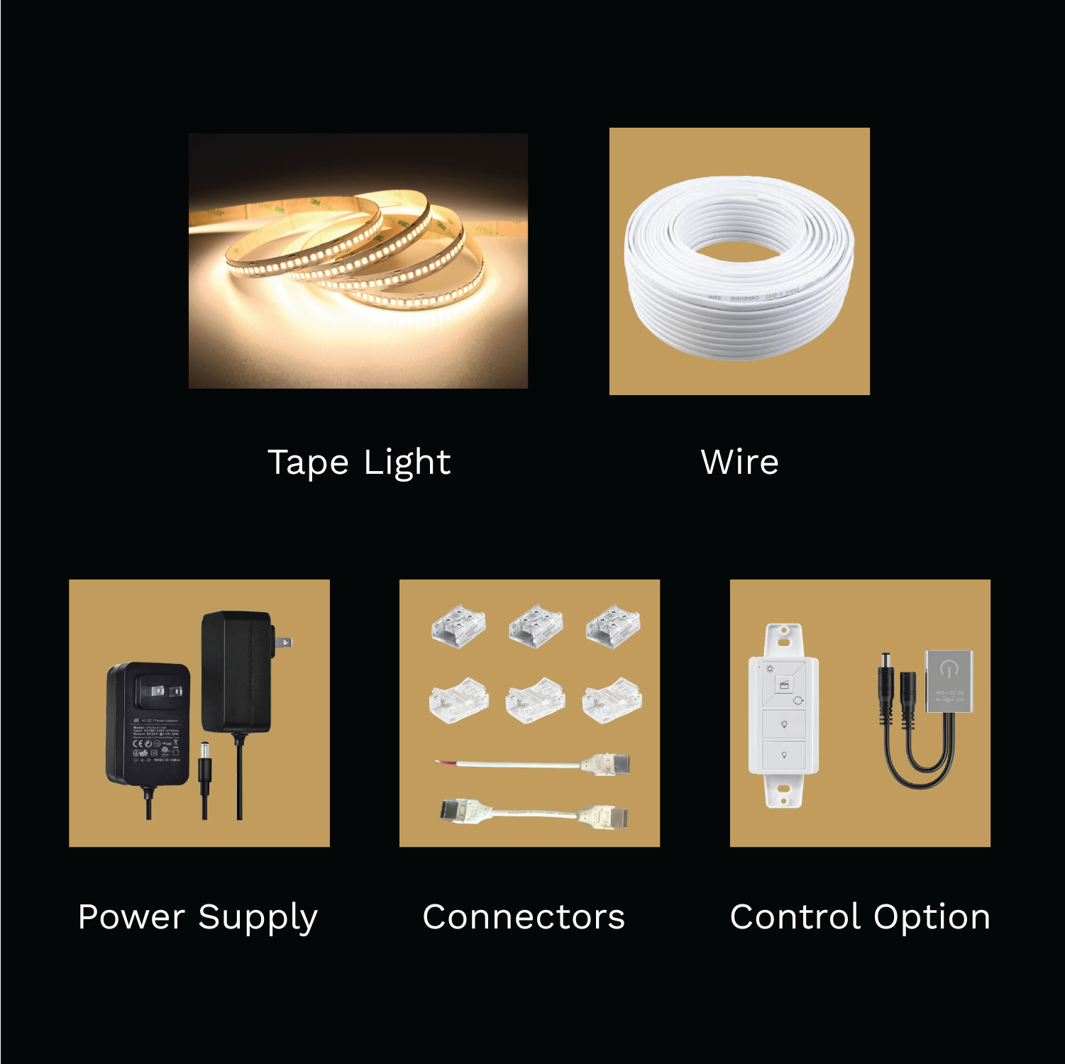Cliff-Tek’s Tape Light Kits include everything needed in one box. Single white, tunable white, touch dimmer, or wireless dimmer options are available to choose from. Tape Light Kits include the tape light, power supply, connectors, wire, and control option.